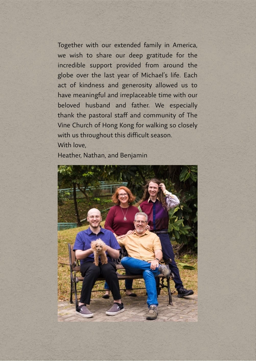 A final touch for the memorial involved a somewhat local custom. In Hong Kong, guests are often given a white flower to place on the deceased’s coffin during a funeral. Michael was cremated right before Christmas (I’ll share more about that later), so we did not have a coffin there, and chose not to have his ashes present (again, more on that later). The funeral home provided us with a large framed photo of Michael, cropped from a favorite family photo taken by our talented photographer friend Coco. We invited each guest to come forward to place a white rose in front of his photo, to have a private moment of remembrance. On the livestream, viewers spontaneously began putting flower emojis in the chat during this time, and I know my technology-loving husband would have appreciated the gesture. Hong Kong has been home to us for nearly ten years, so I loved being able to incorporate this small nod to our adopted city.