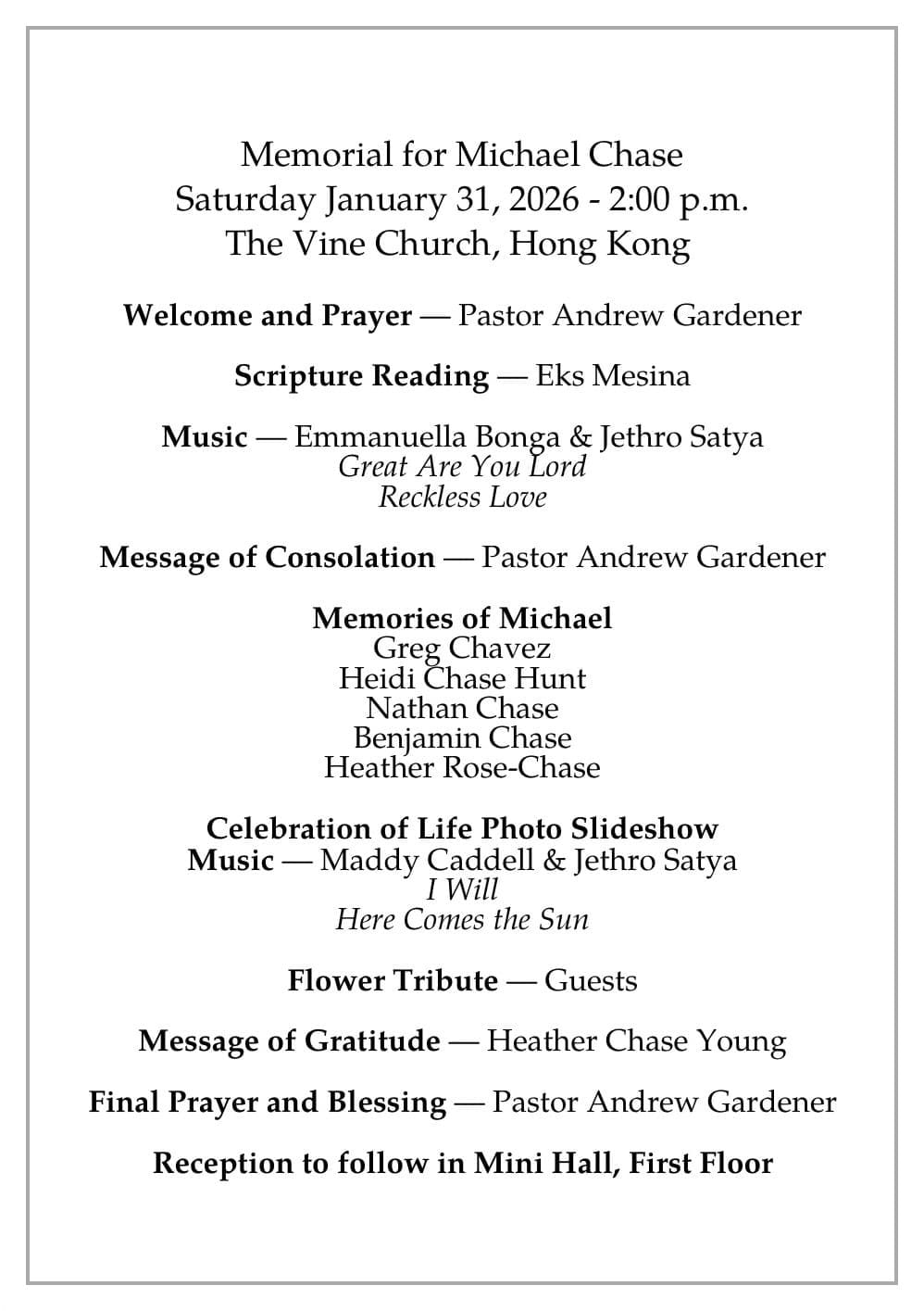 Saturday January 31, 2026 at 2:00 pm Hong Kong time, we held a public memorial for all who knew Michael to have a chance to pay their respects to a great man who was very loved.