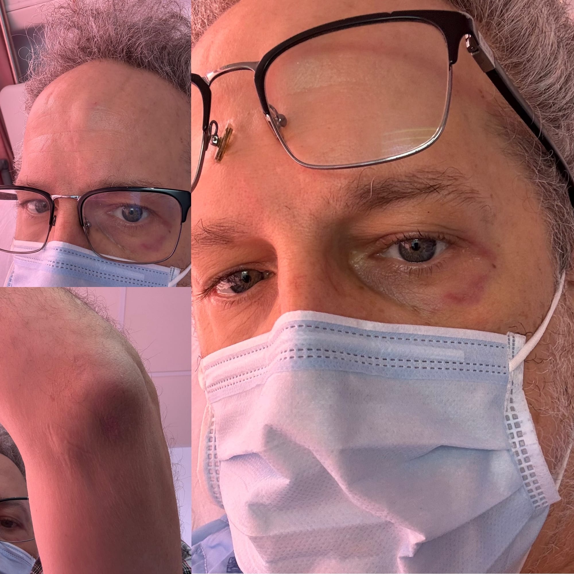 My Hb dipped below 7 on January 6th and kept hovering in that range. I had been feeling dizzy and weak, but I thought if I went slowly and hugged the wall on my short walks to the bathroom, just 6 meters (or 20 feet) away, I would have it all under control. But close to midnight on January 12th, I went to use the facilities, and on the way back I blacked out and fell on my face, landing on a couple rolling IV stands and blood pressure monitor legs. My roommates were awake and witnessed the fall, and started shouting for the nurses. They came quickly and helped me get back into my bed, and inspected me for cuts, bruises, or abrasions.