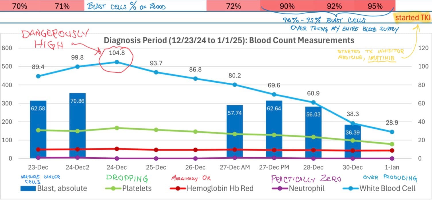 On New Year’s Day, I started taking Imatinib (a Tyrosine Kinase Inhibitor, or TKI), a medication to suppress the mutated chromosome from overproducing immature blood cells. Before I began taking it, you can see at the top of the chart above my blast cells were at 95%, nearly taking over my entire blood supply.