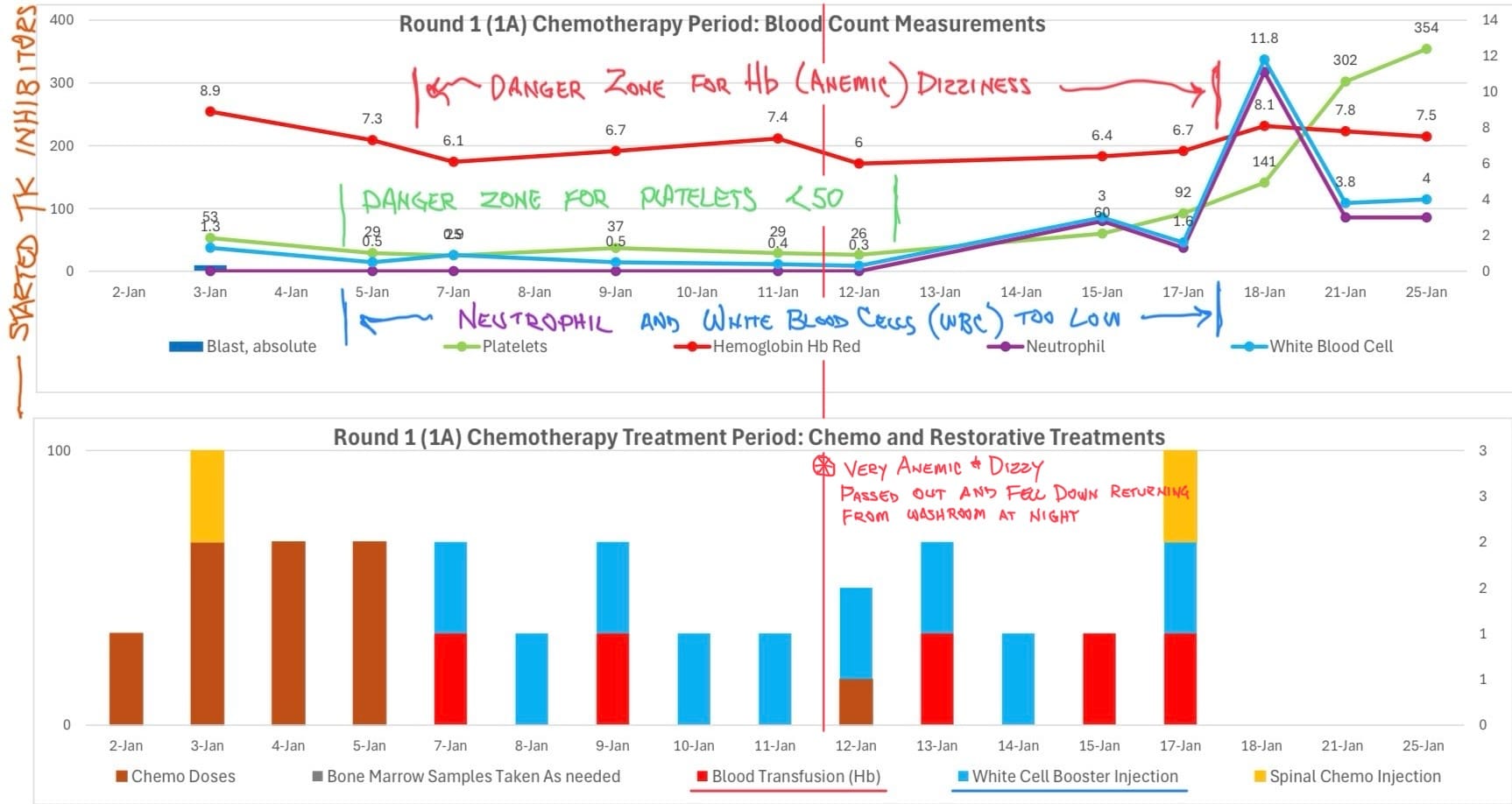 On January 2nd I began chemotherapy. You can see my Red Blood Cells (or Hemoglobin, Hb) and Platelets dropping shortly after starting. Red Blood Cells deliver oxygen to your body, and a lack of them will result in anemia. The danger zone is anything under 7. I found this out the hard way.